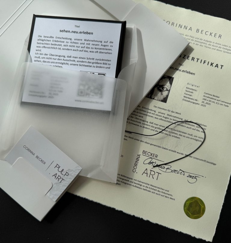 Bei Versand verschicke ich das Werk mit einem Paket-, Kurier- oder Speditionsdienst, je nachdem welche Größe das Kunstwerk hat und wie es aufgrund der Größe verpackt werden muss. Zu eventuellen Versandkosten informiere ich dich natürlich zum Start des Prozesses. Neben deinem Kunstwerk erhältst du auf Wunsch ein Echtheitszertifikat für dein Gemälde.