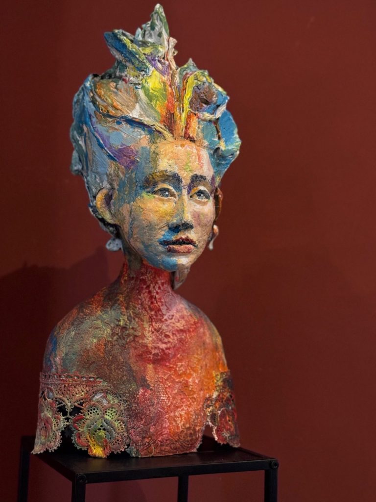 "Sinfonie in Blau" liegt in der visuellen Erzählung einer inneren Entwicklung. Die Skulptur, gefertigt aus rauem Papierpulp, symbolisiert das Formbare der menschlichen Existenz, während die Integration von floraler Spitze als bewusster Kontrast zum rohen Material die feinen, unsichtbaren Verbindungen und Muster repräsentiert, die unser Leben durchziehen.