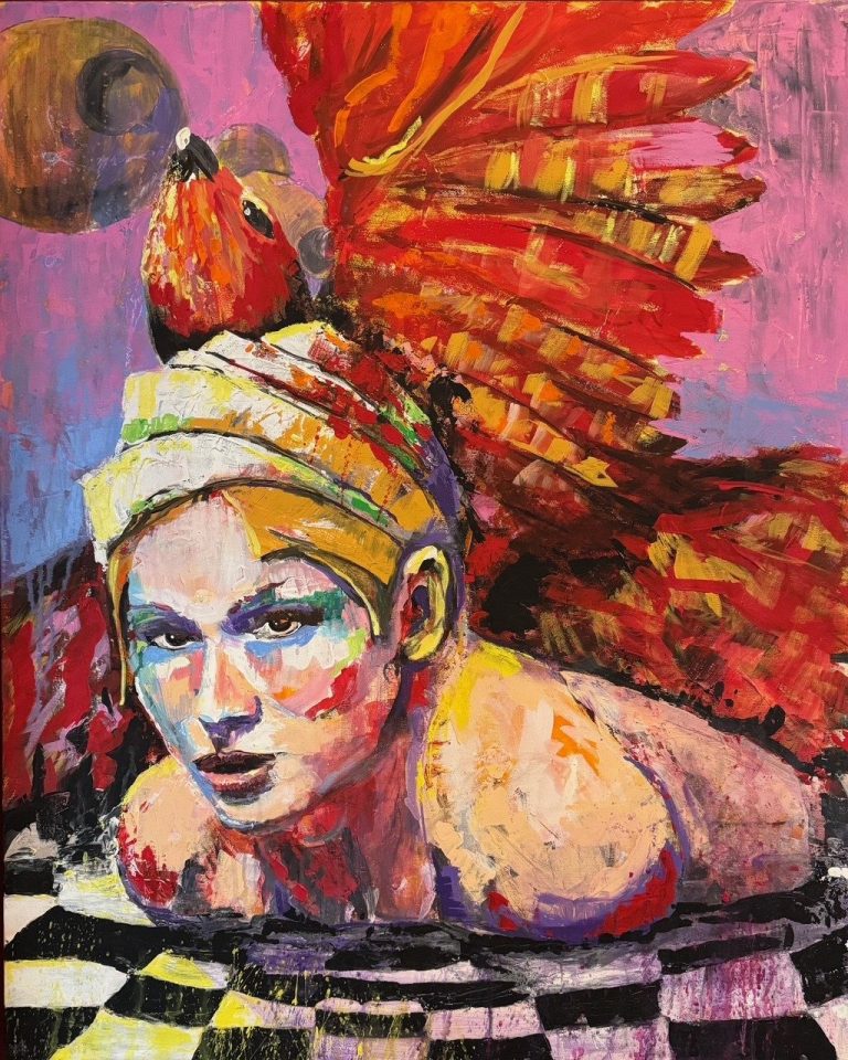 Die kühne Farbwahl und emotionale Pinselführung erzeugen eine dramatische Spannung und vermitteln eine kraftvolle Botschaft über Transformation und Selbstbestimmung.
